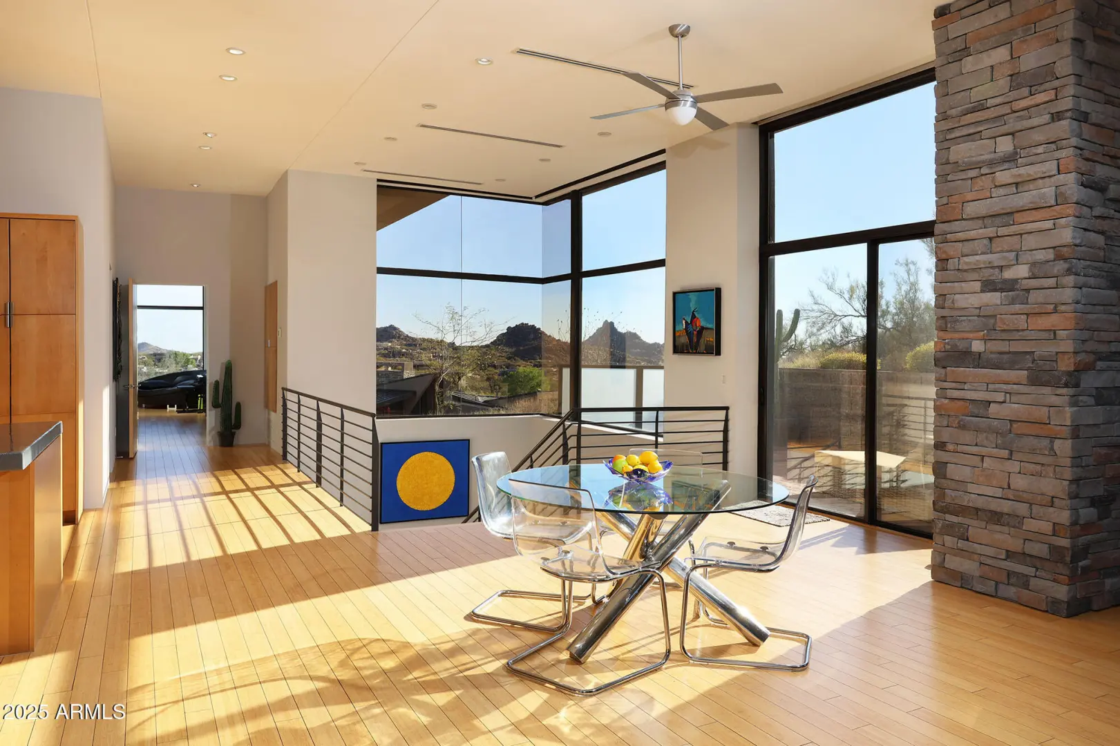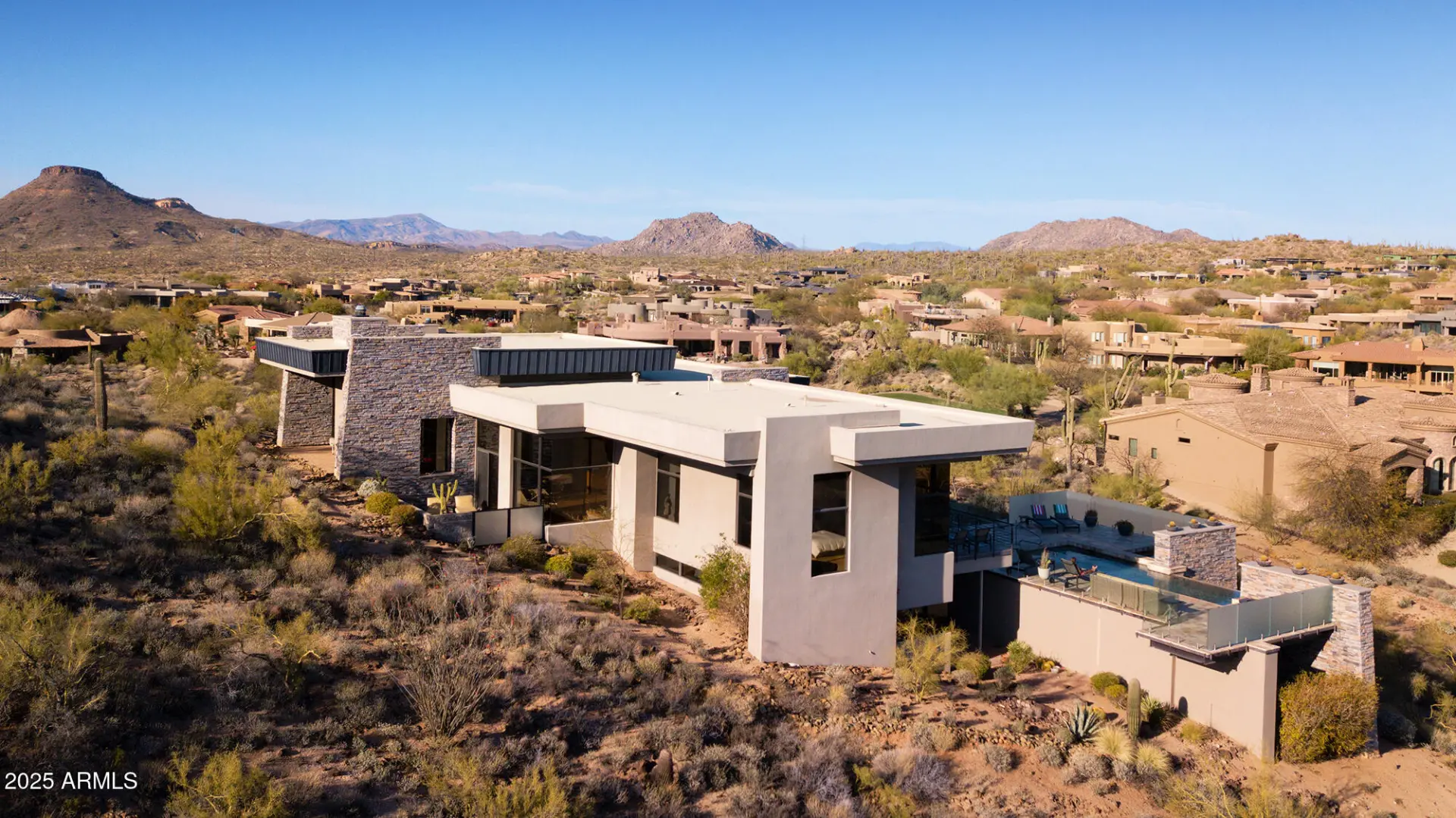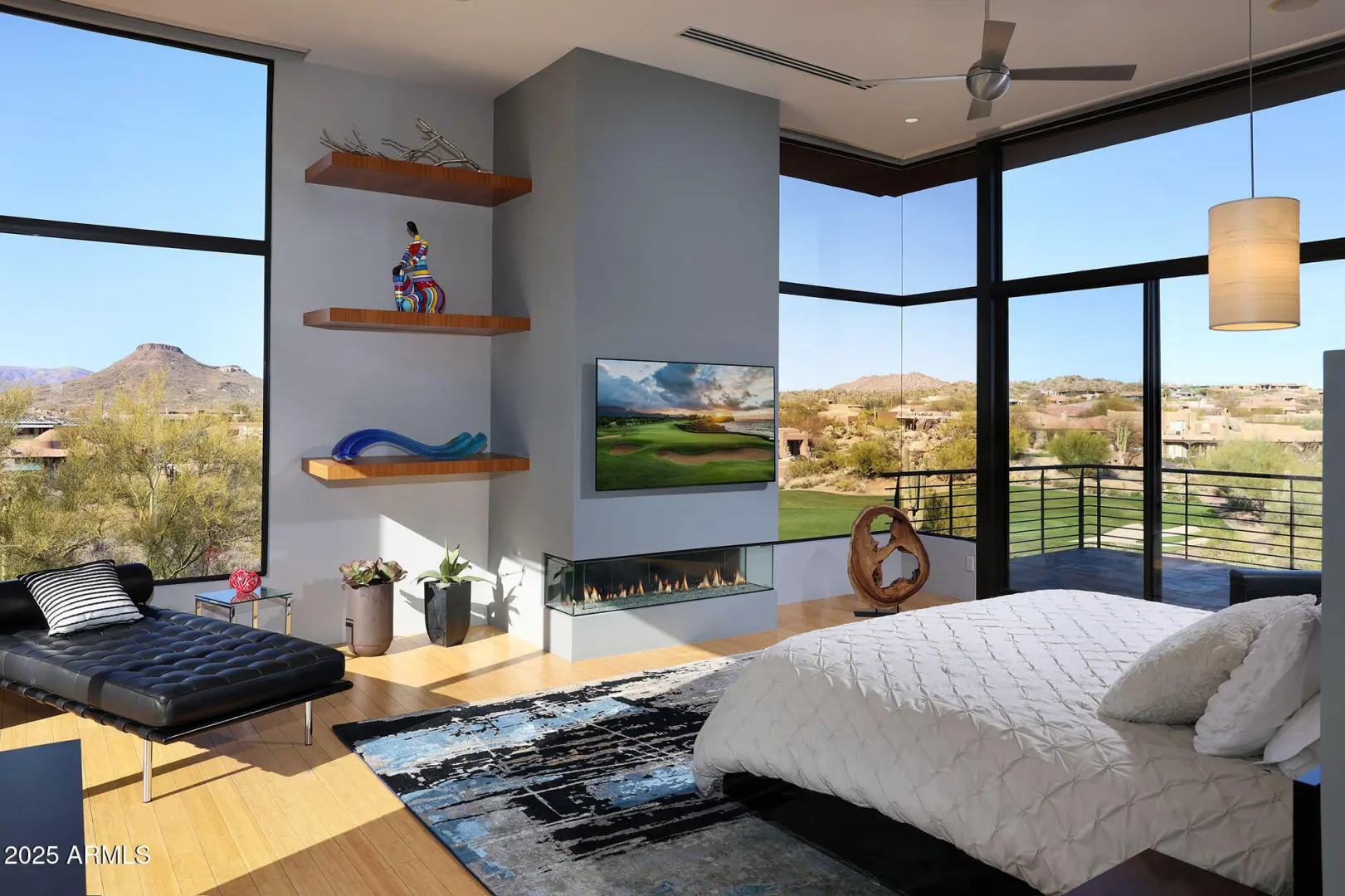 Exquisite Contemporary Built by Sever Design Group situated on 1.75 elevated acres overlooking the 13th green & 14th fairways of the Troon North Pinnacle course w/panoramic views of Pinnacle Peak, Mtns, & city lights. Elegant & casual lifestyle w/exquisite finishes & attention to detail. ELEVATOR from garage to the Main Living Areas with two primary suites all on 1 level. The home includes a total of 5 BR, 5.5 Baths, office, crafts, fitness, den, & formal dining. Chefs Kitchen w/top of the line appliances gas cook top, dbl ovens, two dishwashers, 36'' side by side fridge. The kitchen opens to the great room w/stone accents, fireplace and wet bar. Includes Lutron lighting, motorized shades, & Bamboo floors. expansive outdoor living in front & back, BBQ, heated pool & spa, and 4 car garage