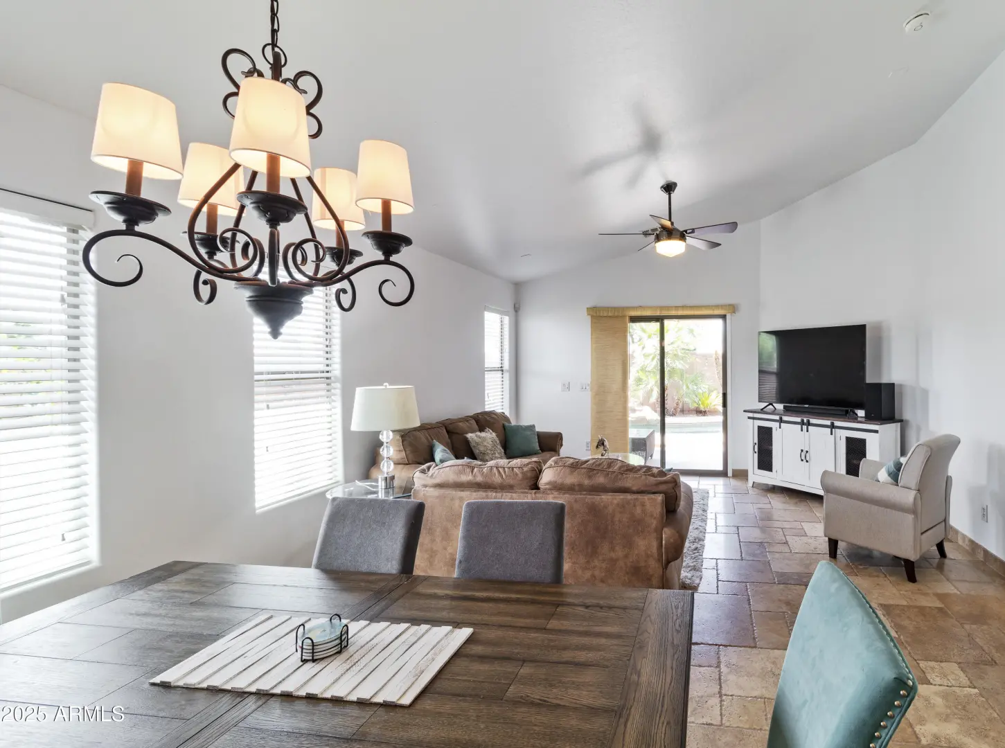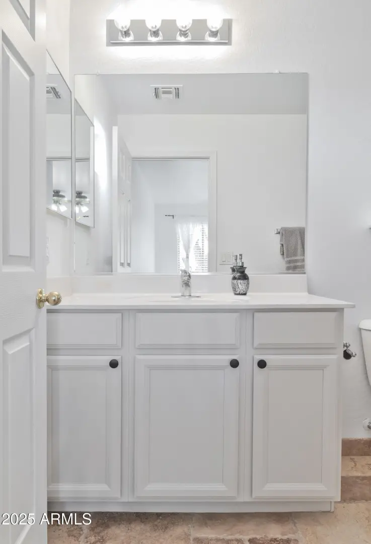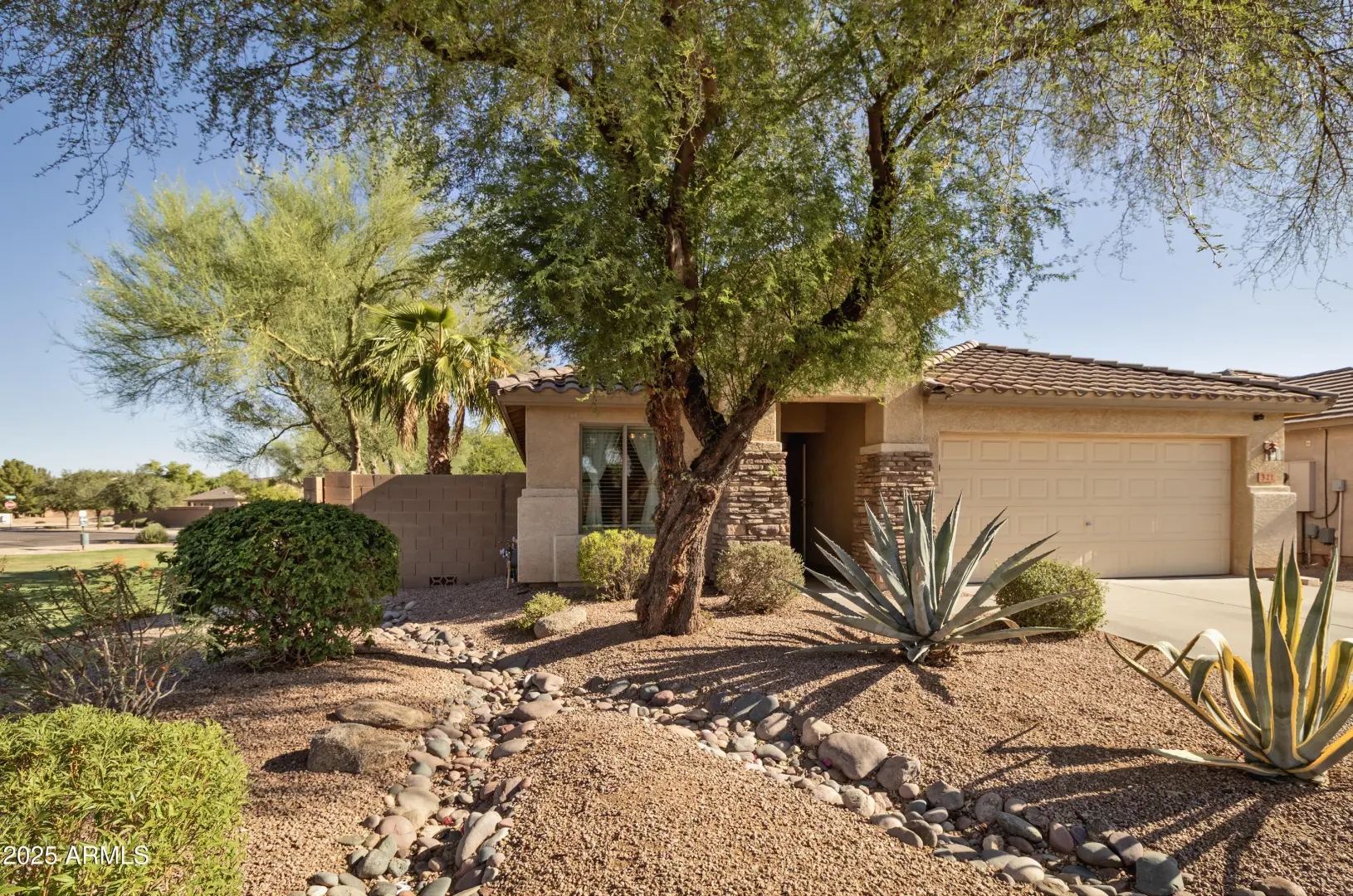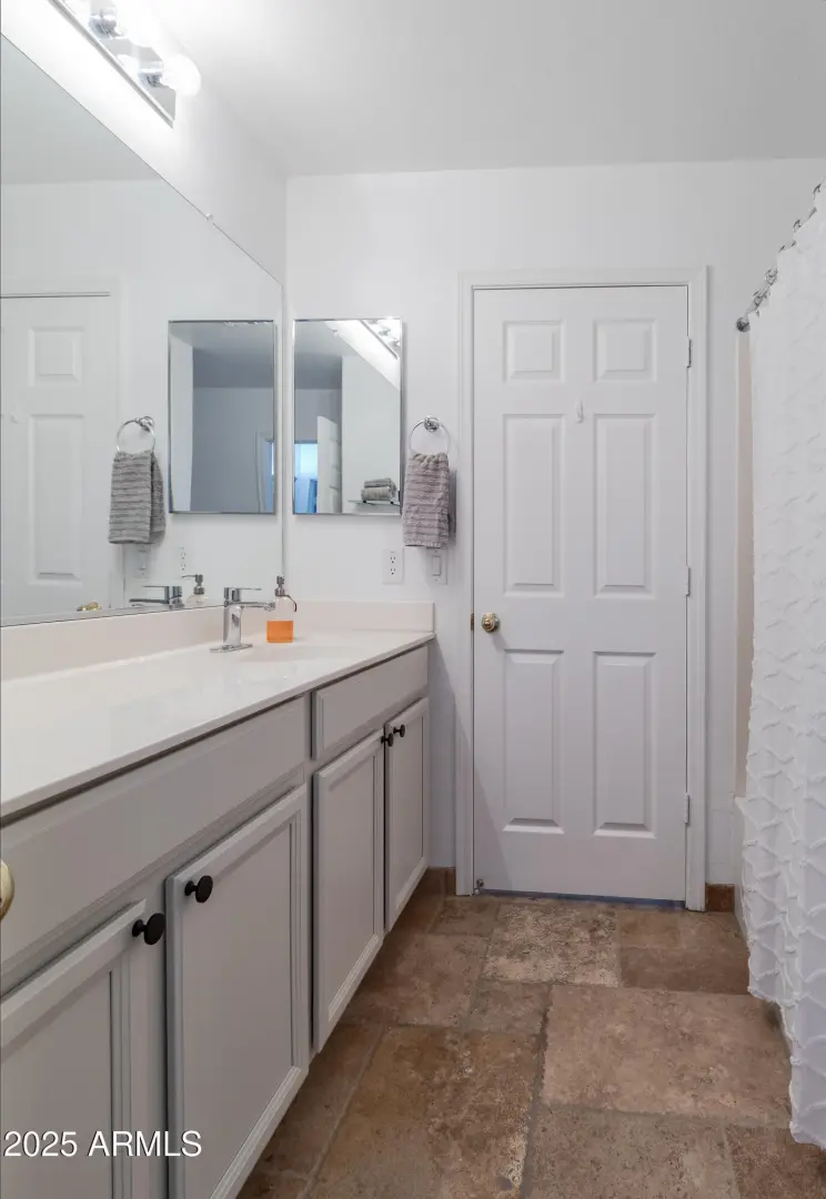 Minutes away from all Queen Creek has to offer, this spacious home lives larger than it's numbers. Situated on a private Corner Lot, this 4 Bedroom, 3 Full Bathroom home has many upscale features: Dual Primary Suites, established Landscaping, Solar Panels and a Stunning Pool with waterfall fountain. Step inside to find limestone floors throughout and an open concept kitchen-living area with a cathedral ceiling - perfect for entertaining family & friends. The pool features BOTH a heater and cooling unit for year round enjoyment.