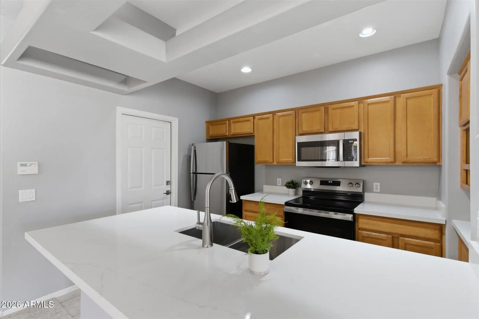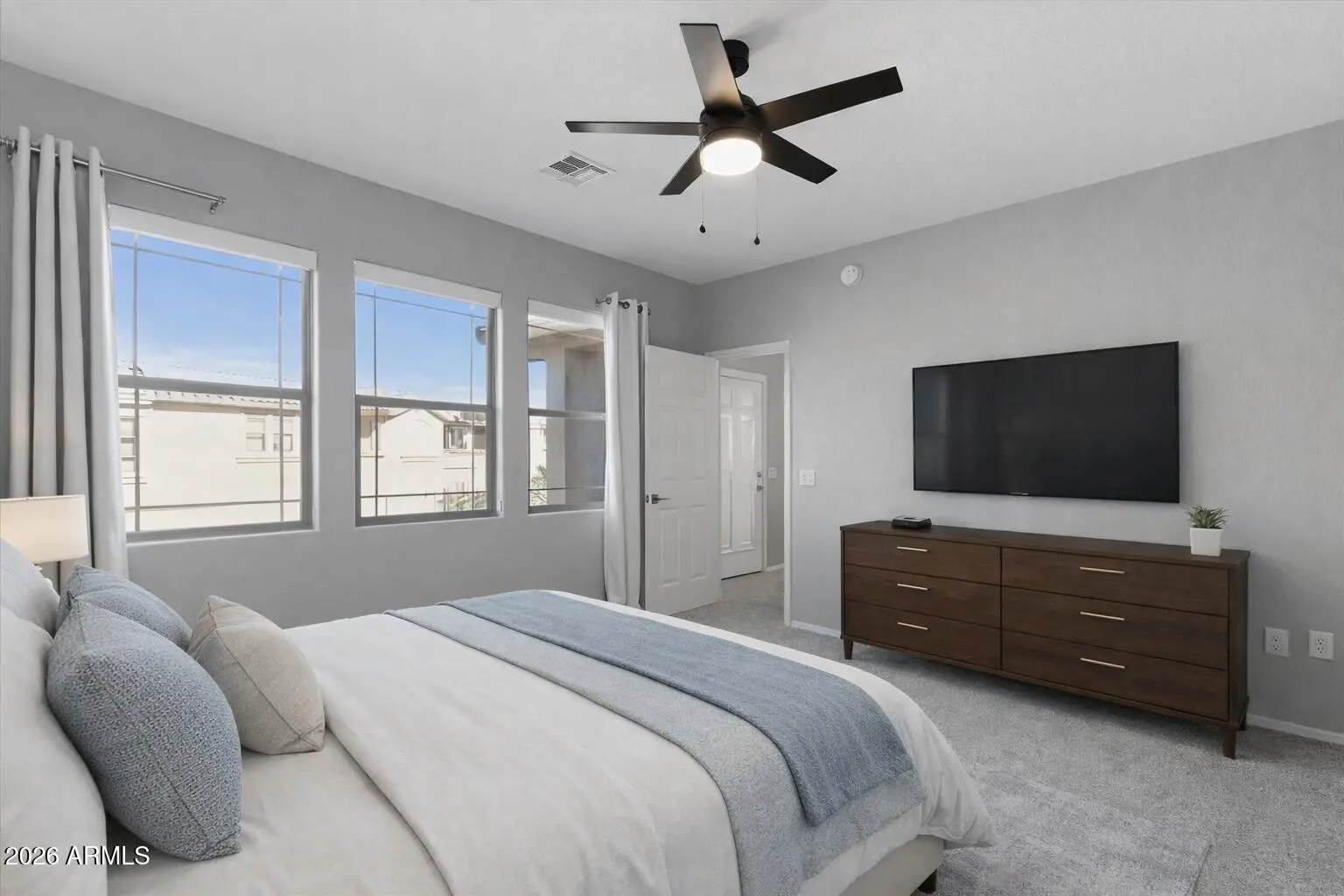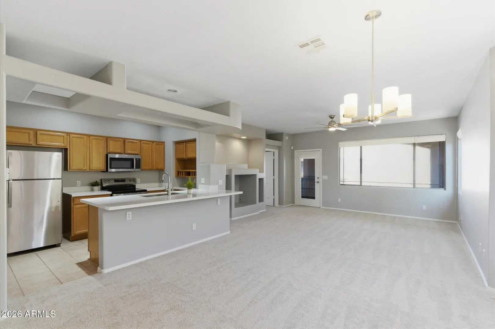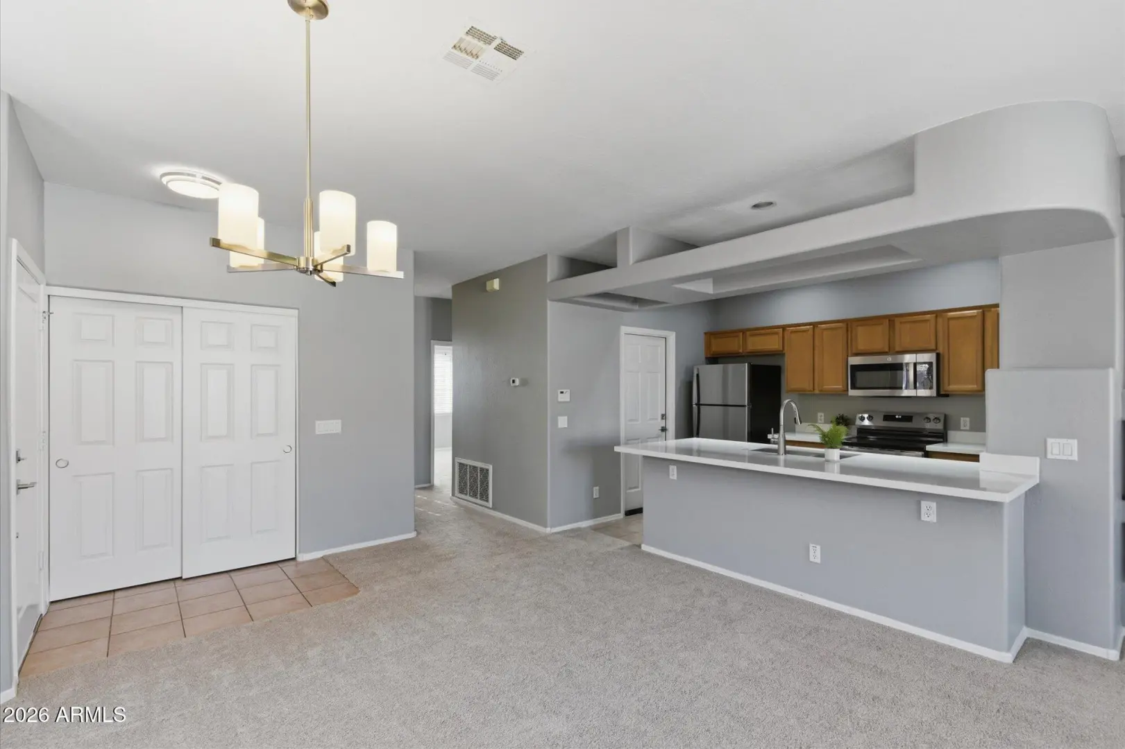 Enjoy resort-style living in this upstairs, modern condo featuring a desirable split floor plan with 3 bedrooms and 2 full baths on one level. The open-concept kitchen offers NEW appliances, a spacious breakfast bar, and flows seamlessly into the dining and living areas. The home has been freshly painted, upgraded with NEW carpet, and showcases modern finishes throughout; ready for immediate move-in. Additional highlights include an attached garage with interior stairway access, in-unit laundry with washer and dryer, ample storage, and blinds throughout. Located in a gated community with a heated pool, spa, fitness center, and clubhouse. Ideally situated near Loop 202, parks, golf, dining, and shopping. Stop by and see this exceptional place today!