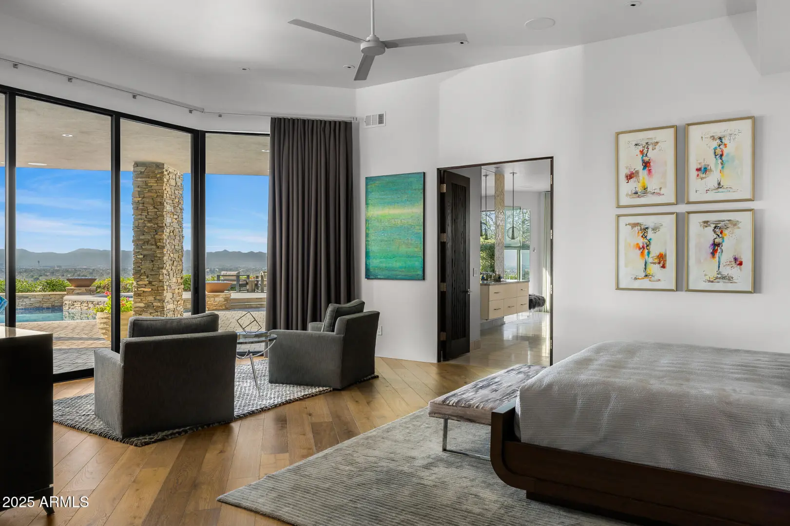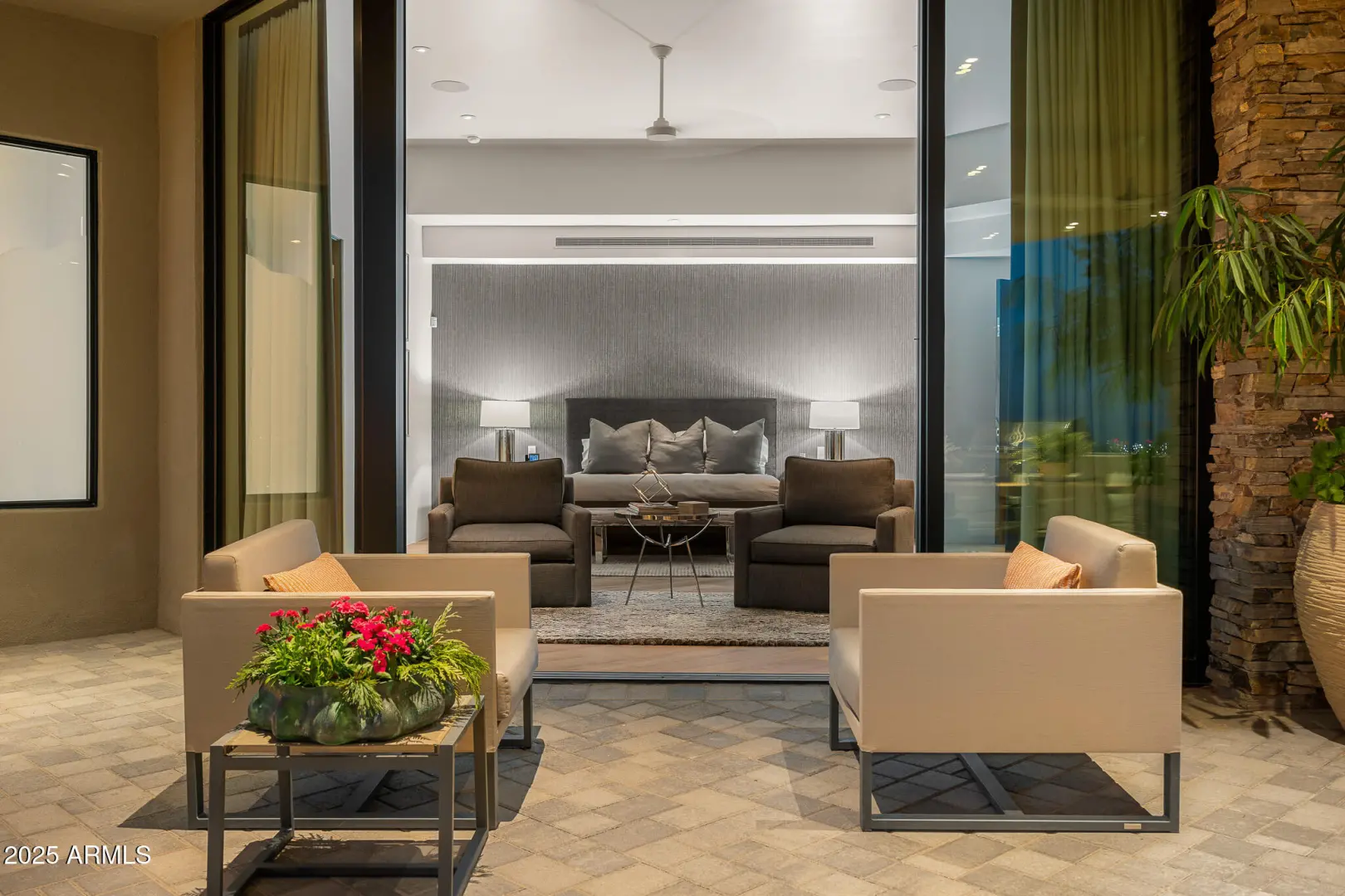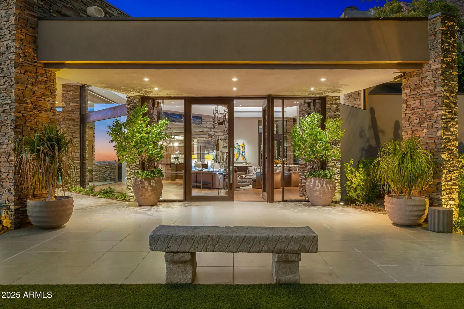 This graceful modern home, on the south side of Camelback Mountain, gives you panoramic views of Phoenix. You'll see the peaks of Papago Park, the twinkling lights of downtown Phoenix, and the vista of South Mountain. The home design seamlessly integrates indoors and outdoors. Its light oak floors, natural stone, and floor-to-ceiling windows reflect the natural beauty of the surrounding desert landscape. This peaceful feeling is enhanced by custom-designed stained-glass windows and doors, teak accents, and cream-colored walls. The living room's wall of windows allow you to relax and enjoy the views below. It is accentuated with natural stone and a light wood ceiling. These earth tones reinforce the indoor/outdoor feeling by mirroring the surrounding landscape.