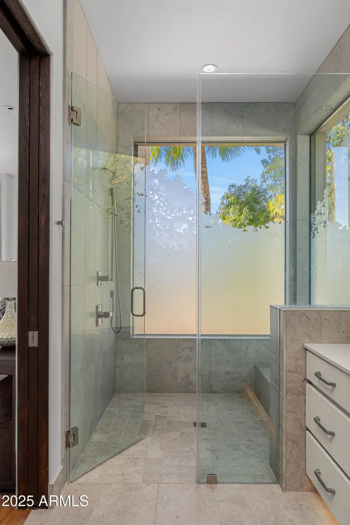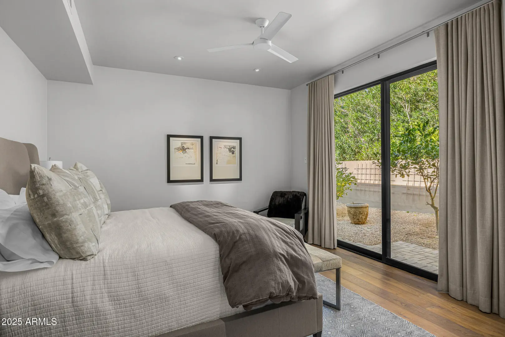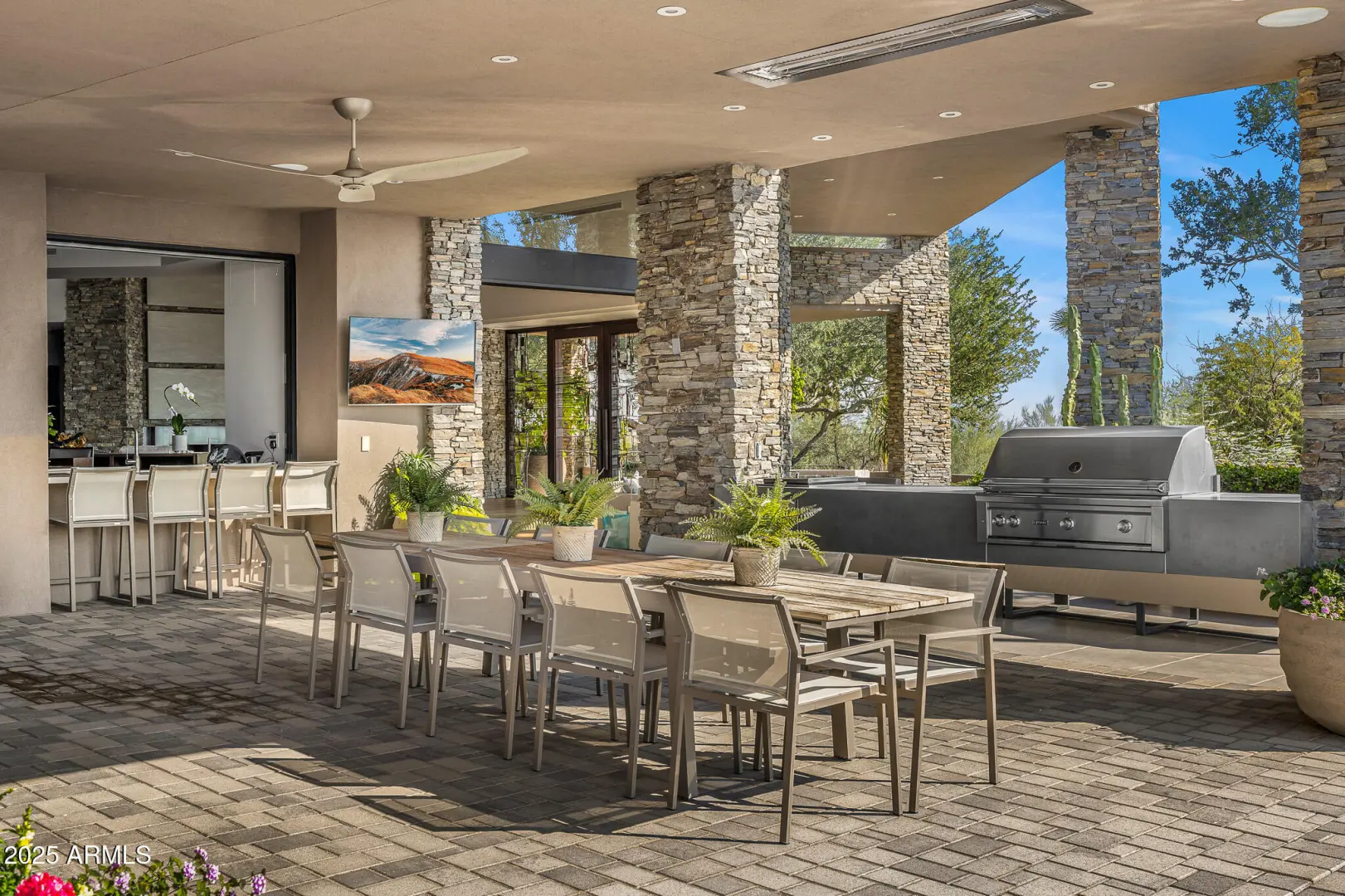 This graceful modern home, on the south side of Camelback Mountain, gives you panoramic views of Phoenix. You'll see the peaks of Papago Park, the twinkling lights of downtown Phoenix, and the vista of South Mountain. The home design seamlessly integrates indoors and outdoors. Its light oak floors, natural stone, and floor-to-ceiling windows reflect the natural beauty of the surrounding desert landscape. This peaceful feeling is enhanced by custom-designed stained-glass windows and doors, teak accents, and cream-colored walls. The living room's wall of windows allow you to relax and enjoy the views below. It is accentuated with natural stone and a light wood ceiling. These earth tones reinforce the indoor/outdoor feeling by mirroring the surrounding landscape.