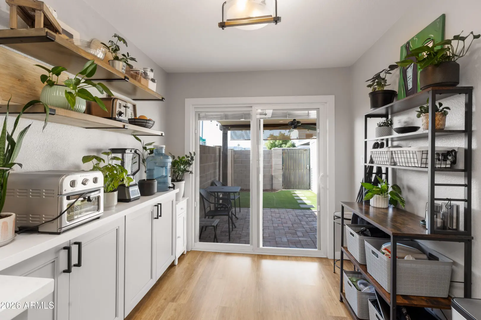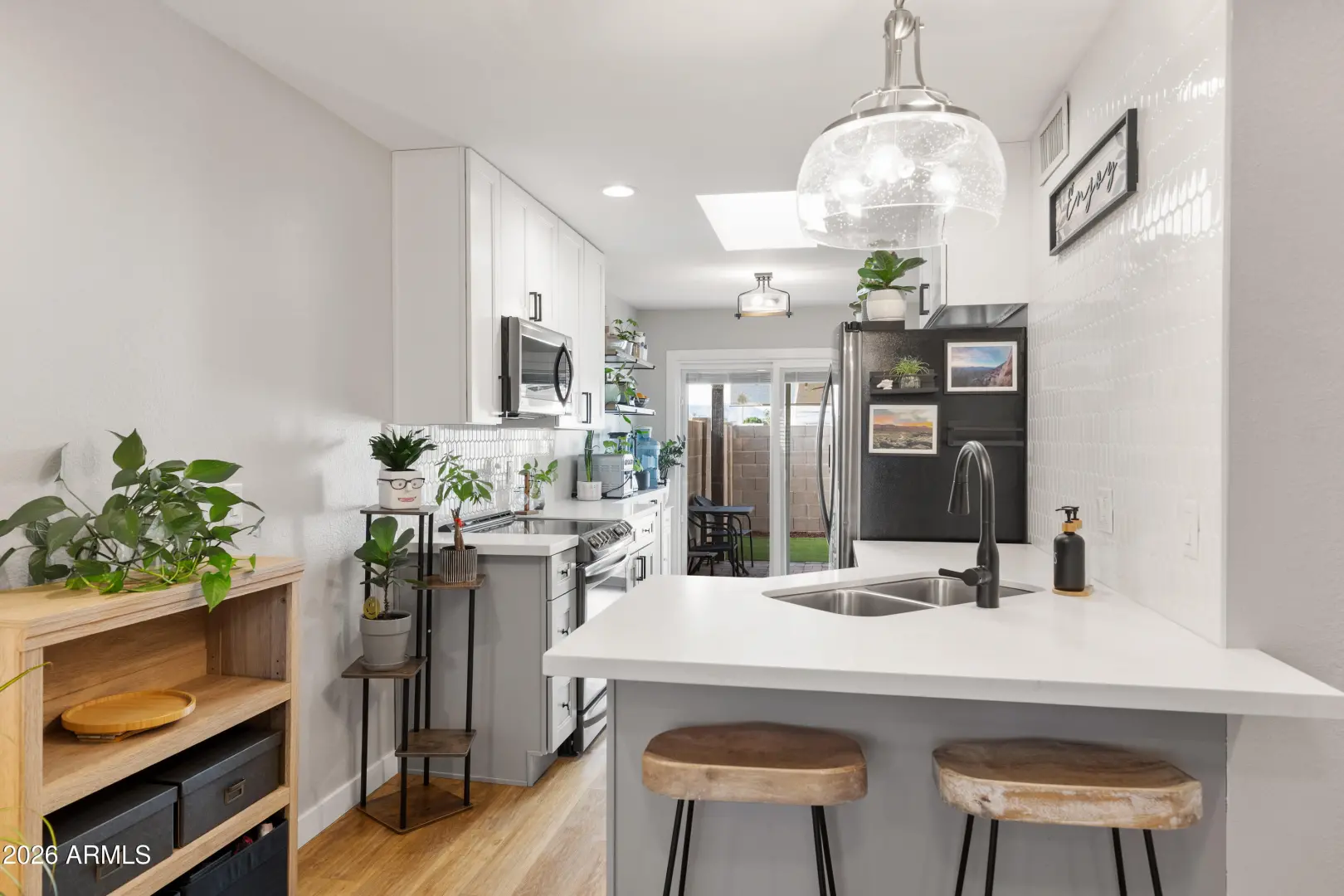 Sunlight and clean lines define this thoughtfully reimagined single-level residence in the heart of Tempe. The interior unfolds with intention, anchored by a beautifully remodeled kitchen where white cabinetry, quartz countertops, and a striking tile backsplash create a crisp, modern palette. A skylight above floods the space with natural light, giving the kitchen an airy, almost gallery-like presence that elevates everyday living. The living area flows effortlessly from the kitchen, finished with warm wood-look flooring, recessed lighting, and contemporary ceiling fans that balance comfort with design. Large sliding doors blur the line between indoors and out, opening to a private, covered patio and enclosed yard that feels calm, curated, and quietly inviting.